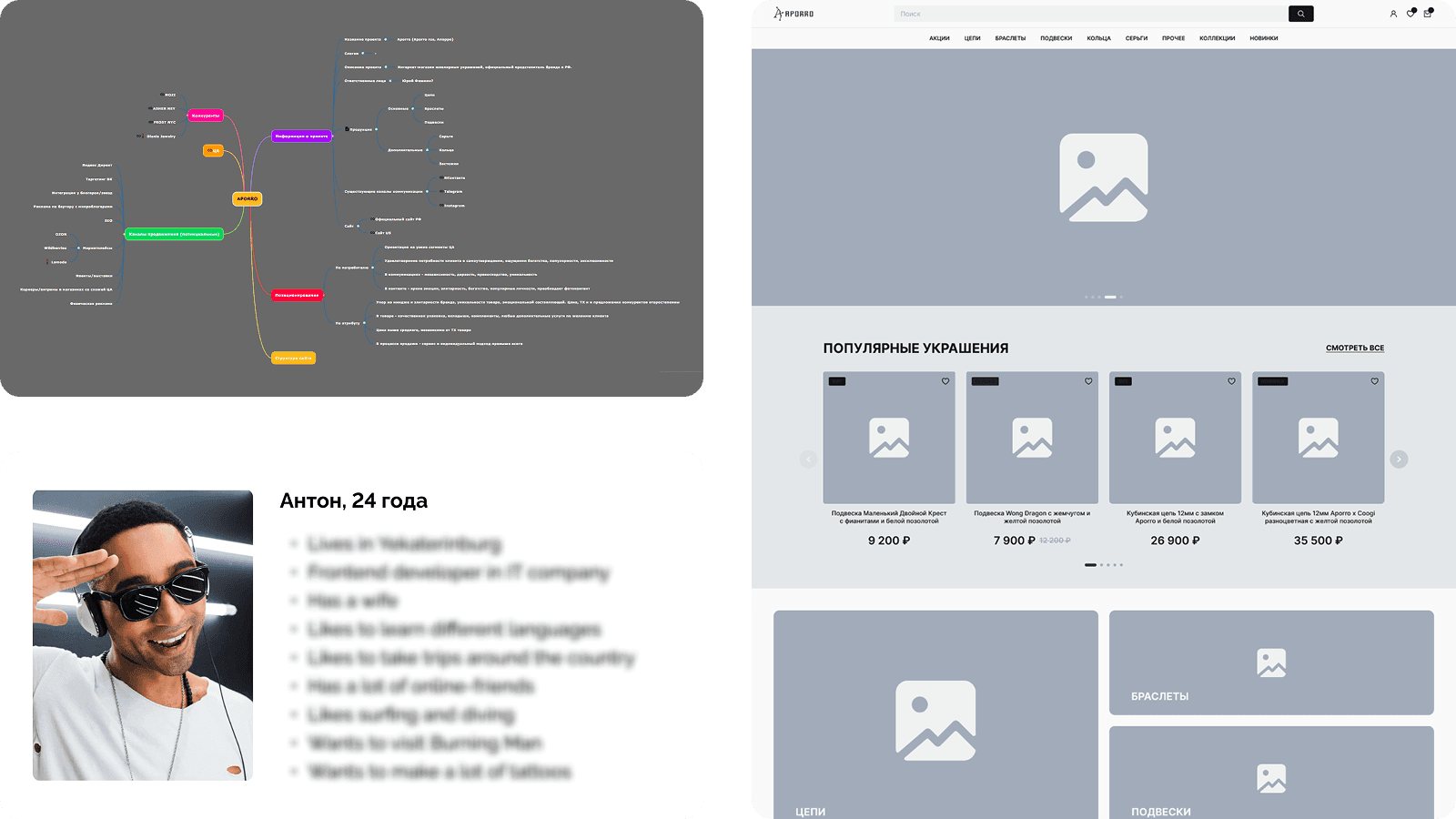 Изучаем ассортимент, аудиторию и бизнес-процессы. Формируем майндмап: как будет выглядеть структура, какие страницы и разделы понадобятся. Прорабатываем путь пользователя от поиска до покупки.