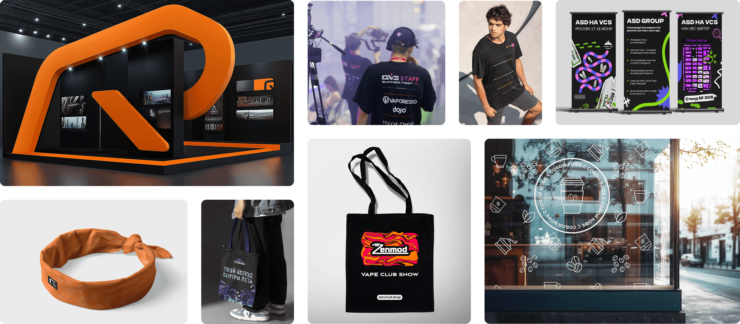 Носители, которые делают бренд частью повседневной жизни — от одежды и аксессуаров до интерьерных объектов, стендов и витрин. Всё, что позволяет бренду стать осязаемым: почувствовать его стиль, ценности и характер.