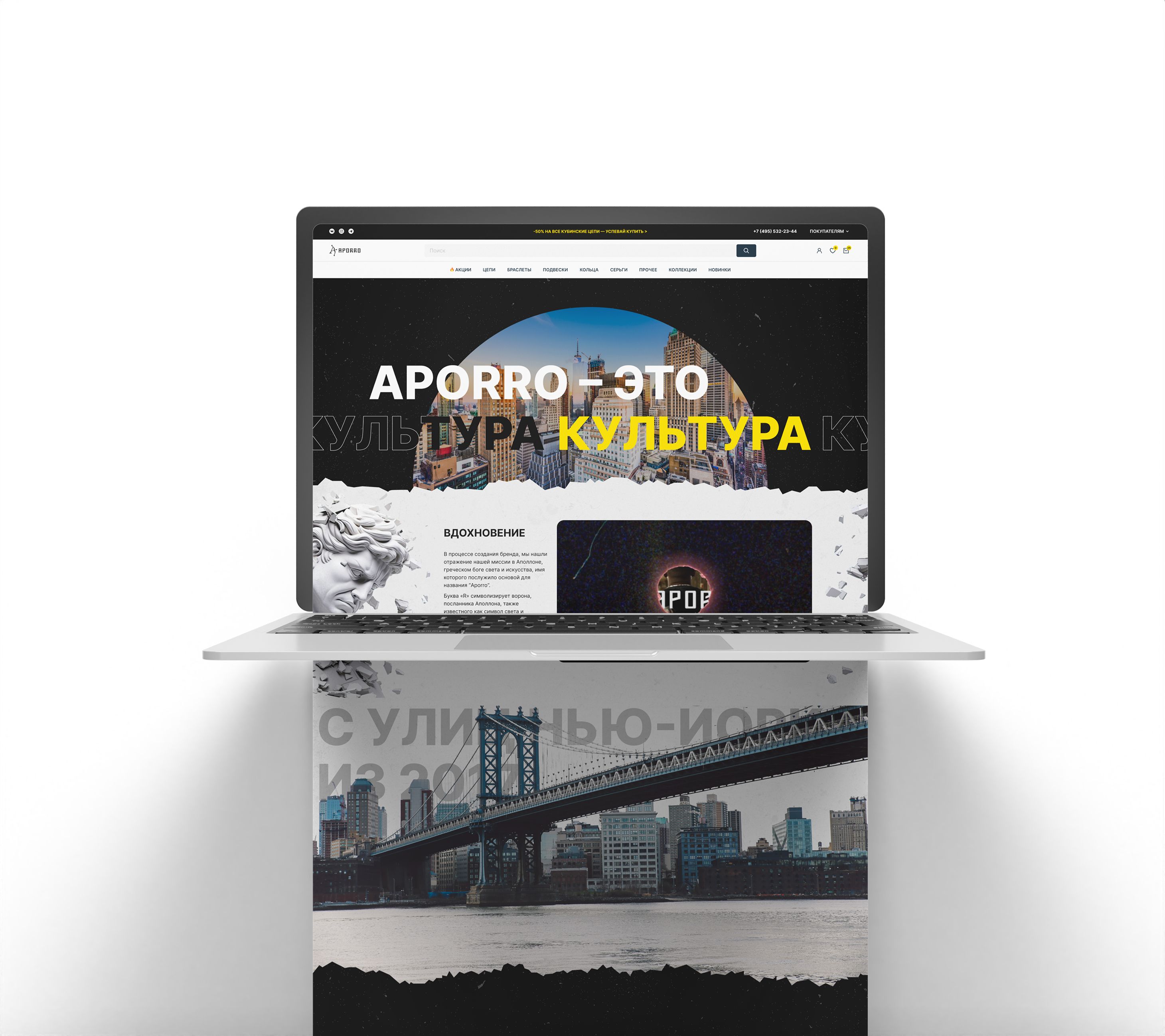 Первый экран лендинга сразу задаёт контекст: глобальный бренд, родившийся в Нью-Йорке, и его путь к российской сцене. Визуально мы соединяем панорамы города, уличные фактуры и предметные съёмки украшений. Над этим — простое и честное заявление: Aporro — это не тренд на сезон, а культура, которая пришла в Россию и СНГ из мирового хип-хоп движения.