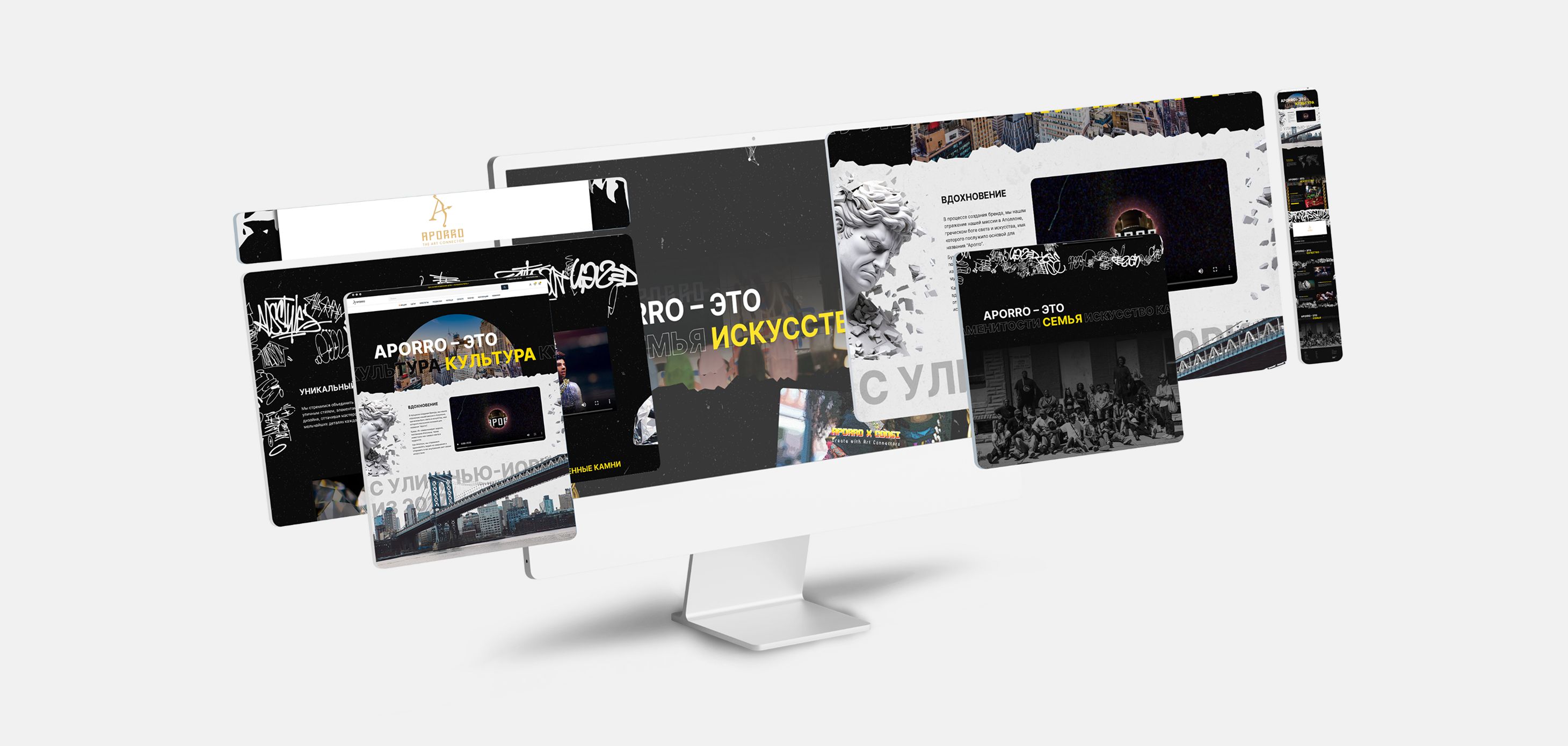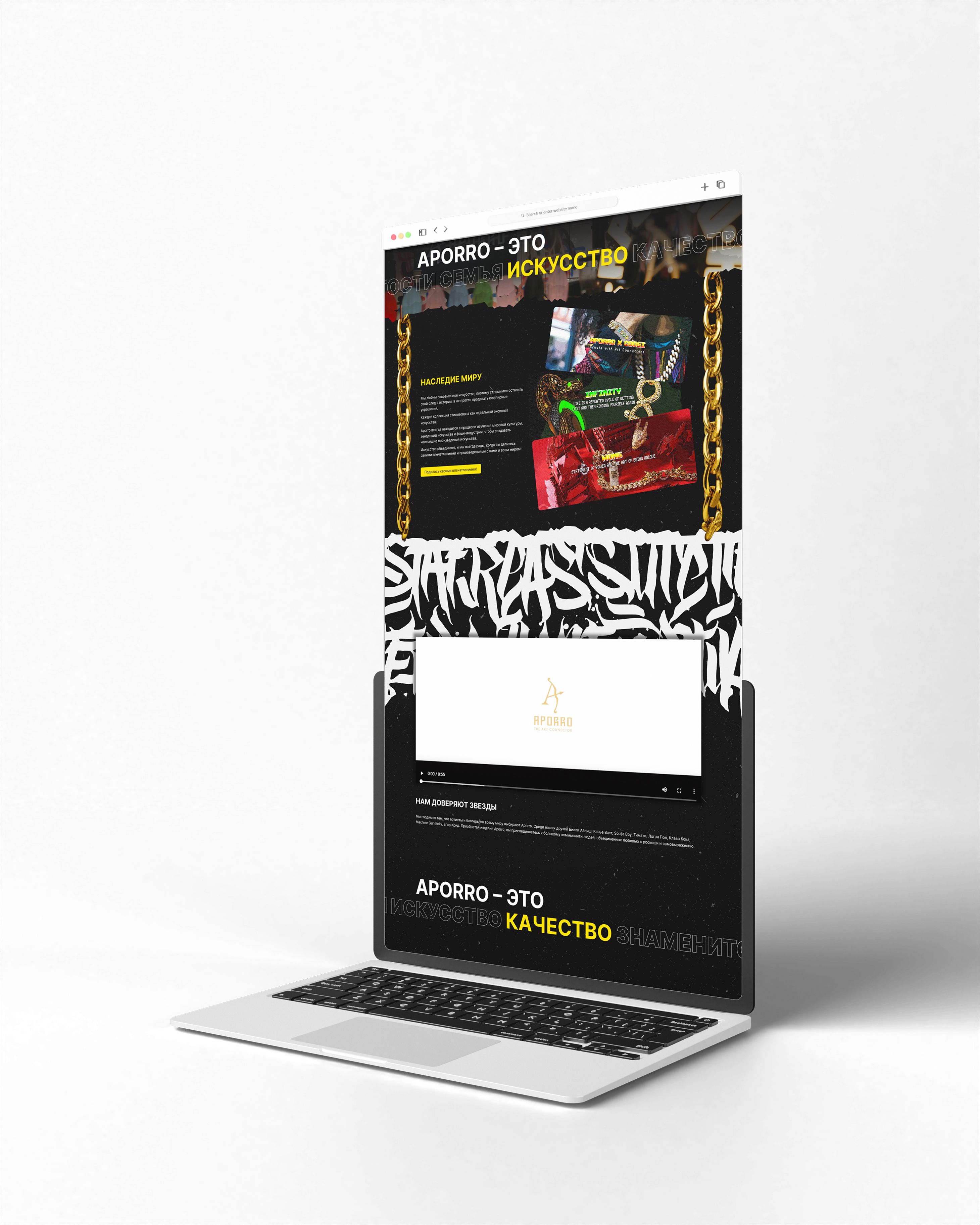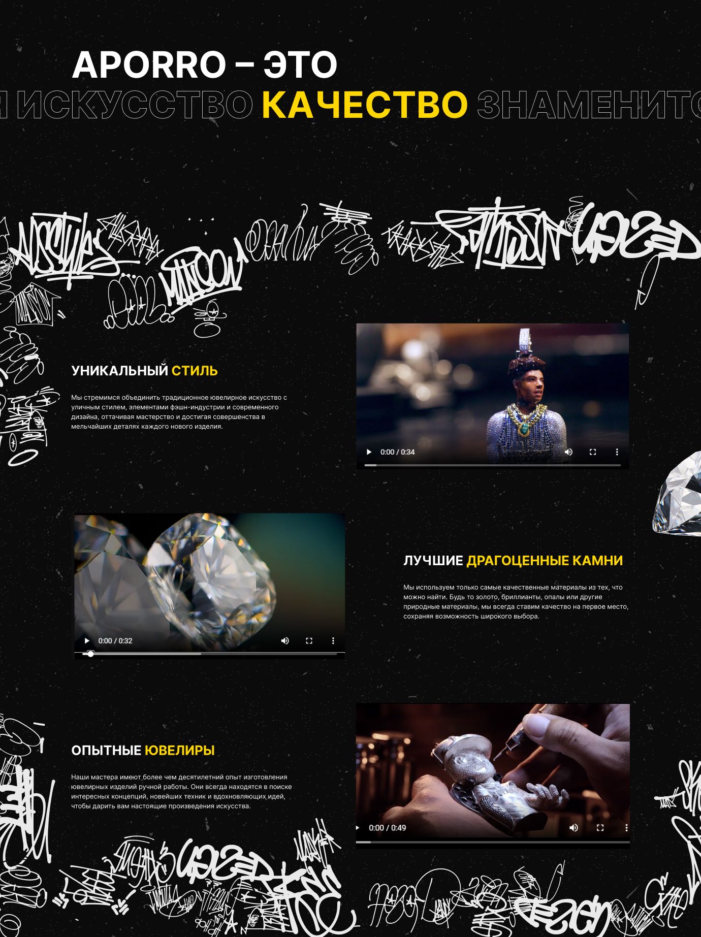 Каждый элемент лендинга должен был транслировать характер Aporro: дерзкий, уличный, роскошный, а также показать ценности и философию бренда.