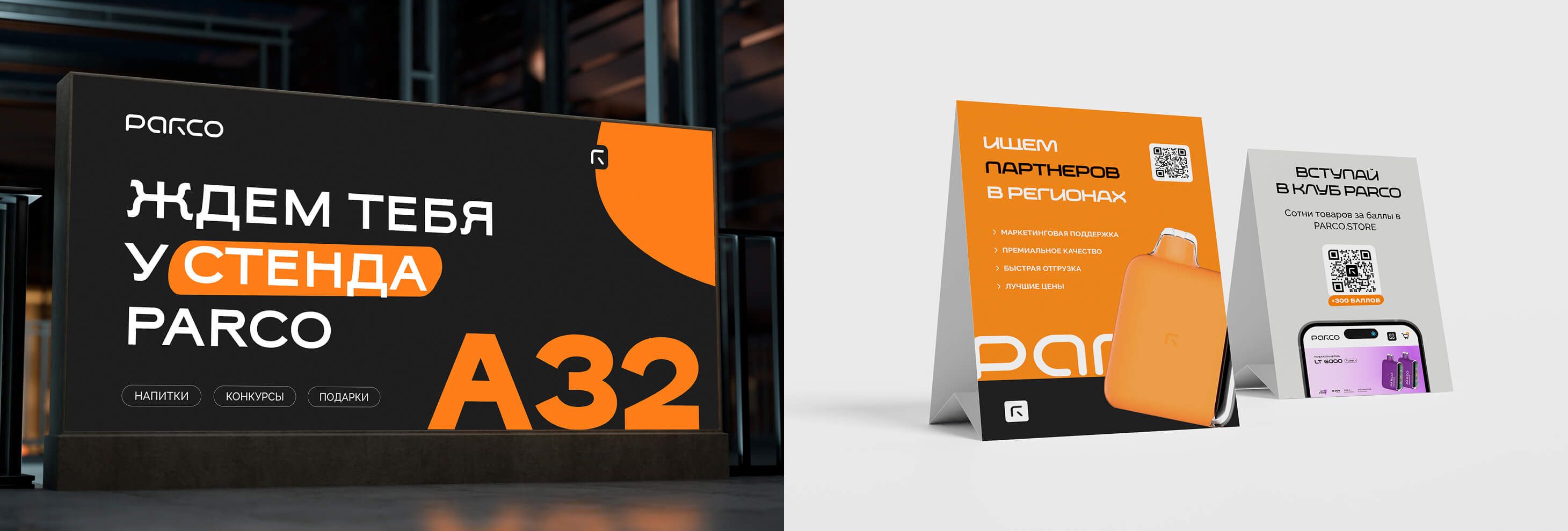 В центре стиля — фирменный оранжевый цвет Parco, насыщенный, энергичный и легко узнаваемый. Его поддерживают базовые белый и чёрный — они дают чистый фон, усиливают контраст и делают коммуникации более гибкими.