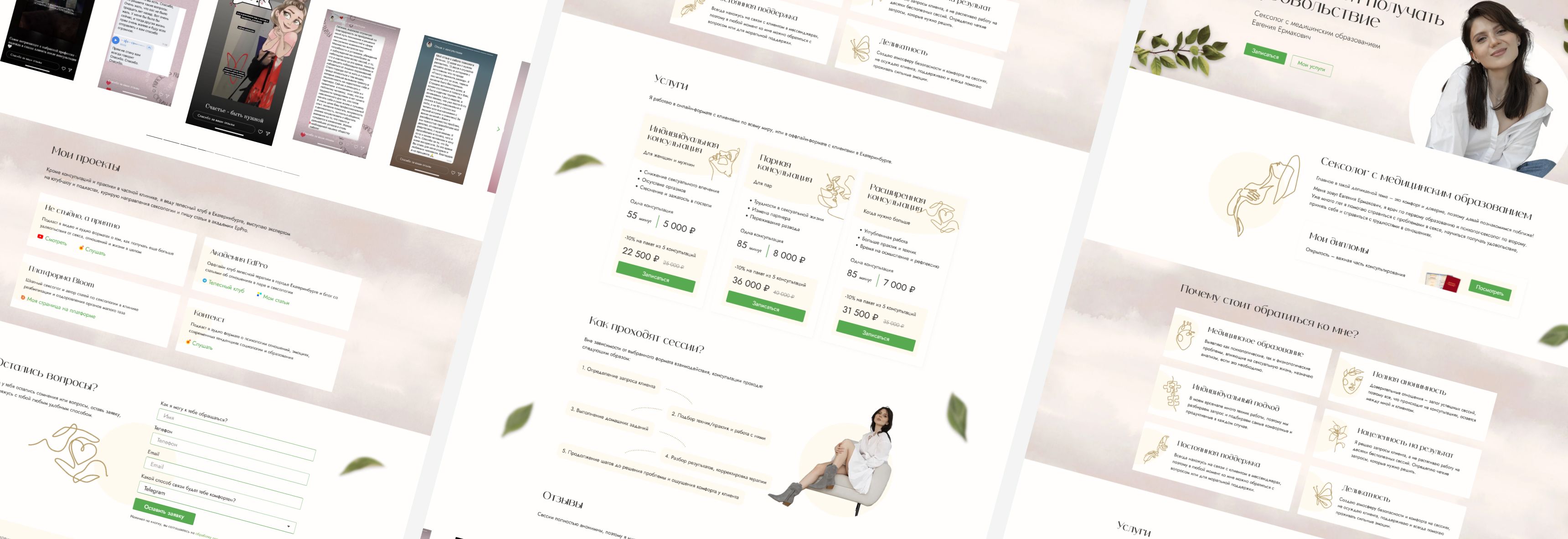 Евгения Ермакович — сексолог с медицинским образованием, работающая с клиентами онлайн по всему миру и очно в Екатеринбурге и Москве. Она помогает разобраться с трудностями в сексуальной жизни, отношениях и принятии себя, ведёт подкасты, участвует в медиа и развивает офлайн-клуб телесной терапии. Сайту нужно было аккуратно собрать все эти роли в одном месте.